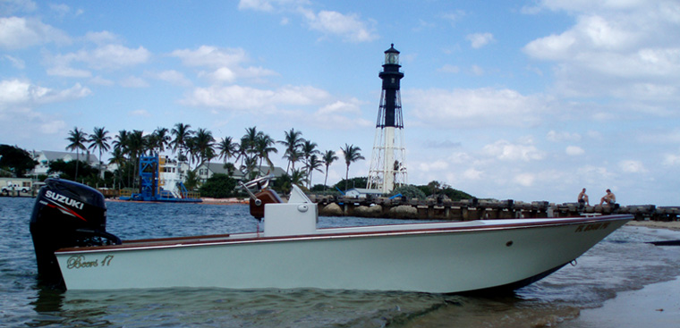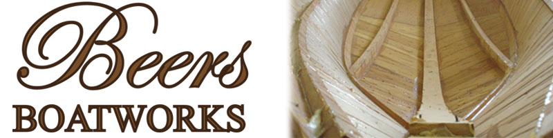We fiberglass the whole boat inside and out with epoxy saturated 18oz. woven roving. The transom is made of 100% mantex space age composite material which is super high density fiberglass reinforced urethane foam. Lighter than wood, it will not rot and will not absorb water. The skeleton, keel, stringers and battens are made of Douglas fir. We then sheet the boat with Okoume marine plywood.